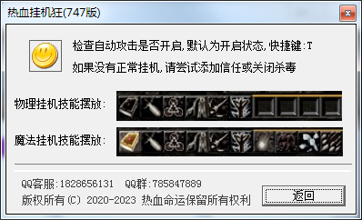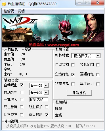 支持功能:人物状态显示、挂机统计、自动喝红蓝、自动吃饲料、一键飞人、死亡截屏、切换交易、残血保护、窗口跟随